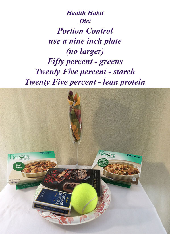 Use a Nine inch plate (no larger). 50% greens, 25% starch, 25% lean protein.